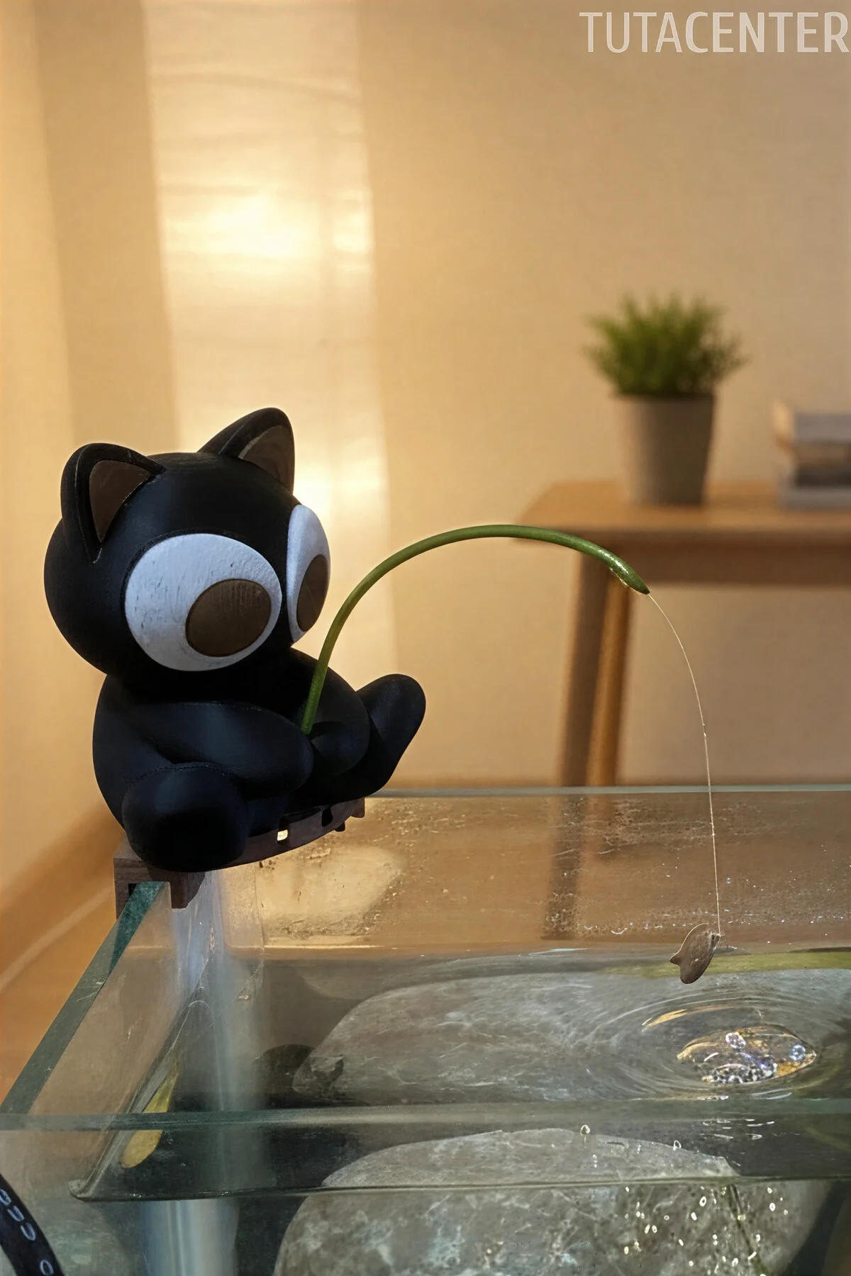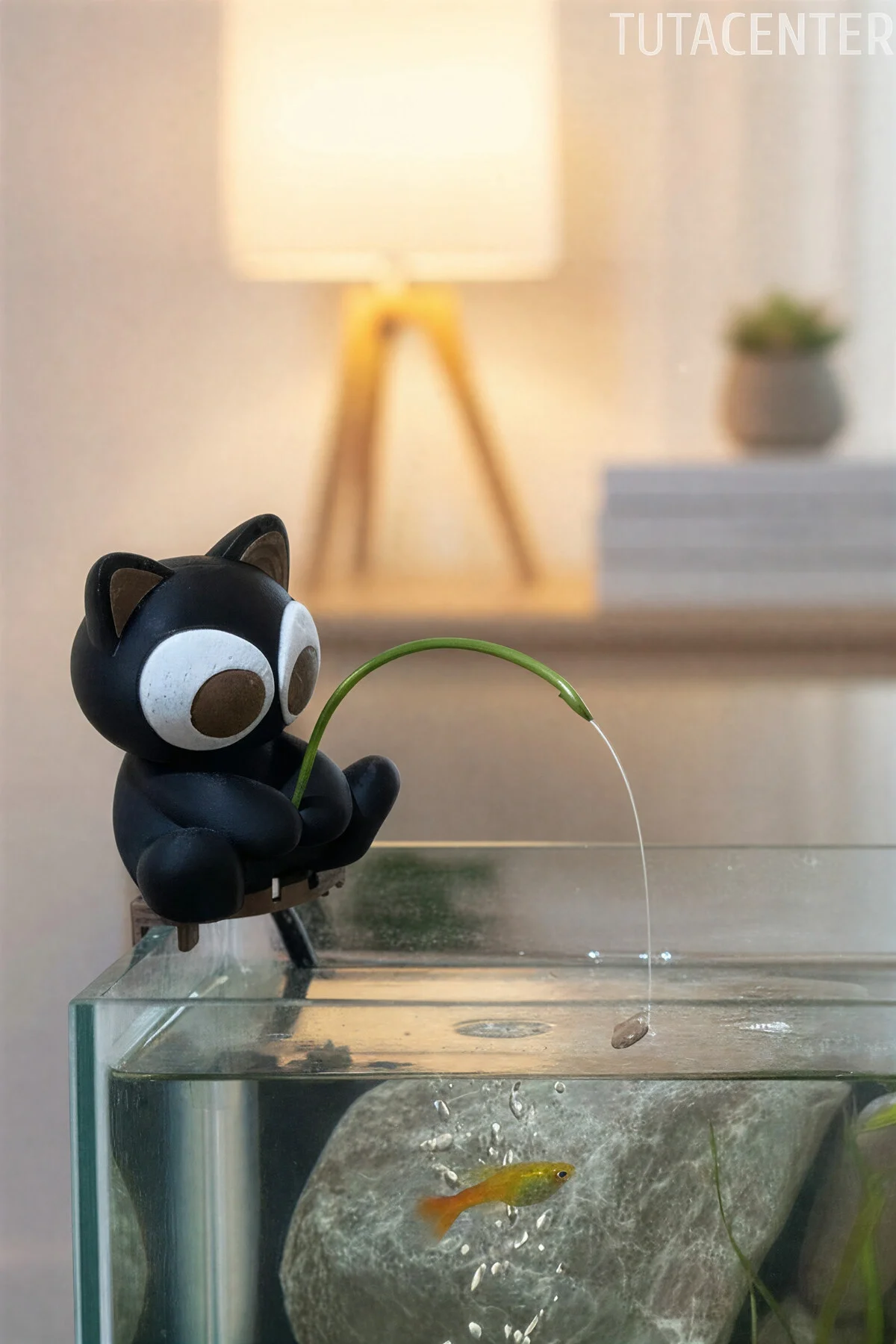 Akvaryum kenarına oturmuş, oltasıyla balık avlayan bu sevimli kedi figürü, misafirlerinizin ve çocuklarınızın dikkatini hemen çekecek. Detaylı işçiliği ile gerçekçi ve eğlenceli bir görünüm sunar.
