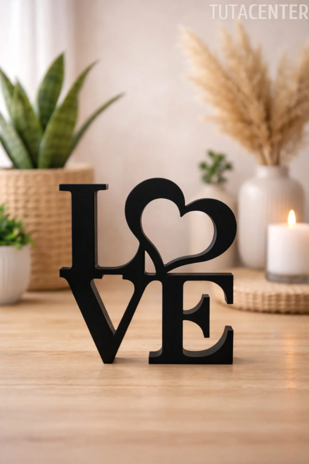 • Kalp detaylı LOVE yazısı, ev dekorasyonunda sevgi ve samimiyet hissi oluşturur.
