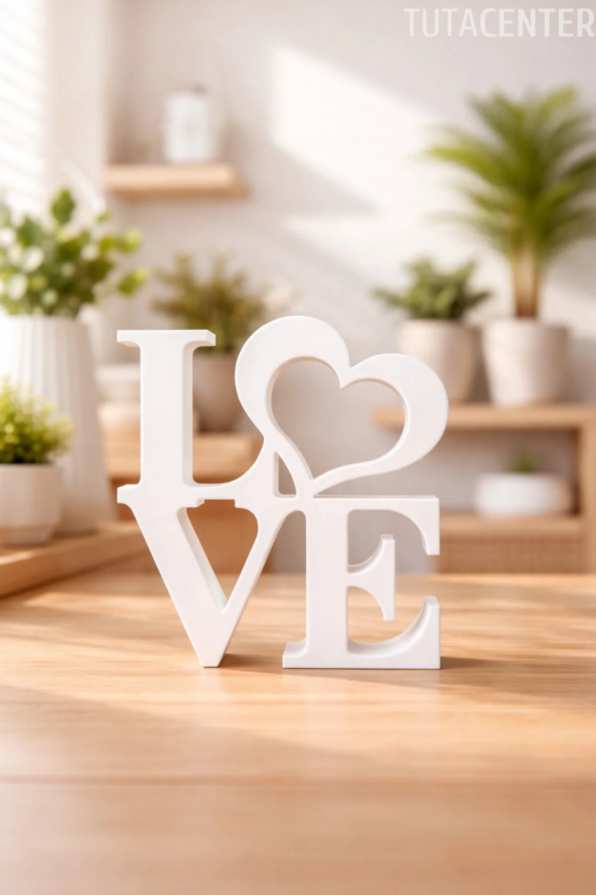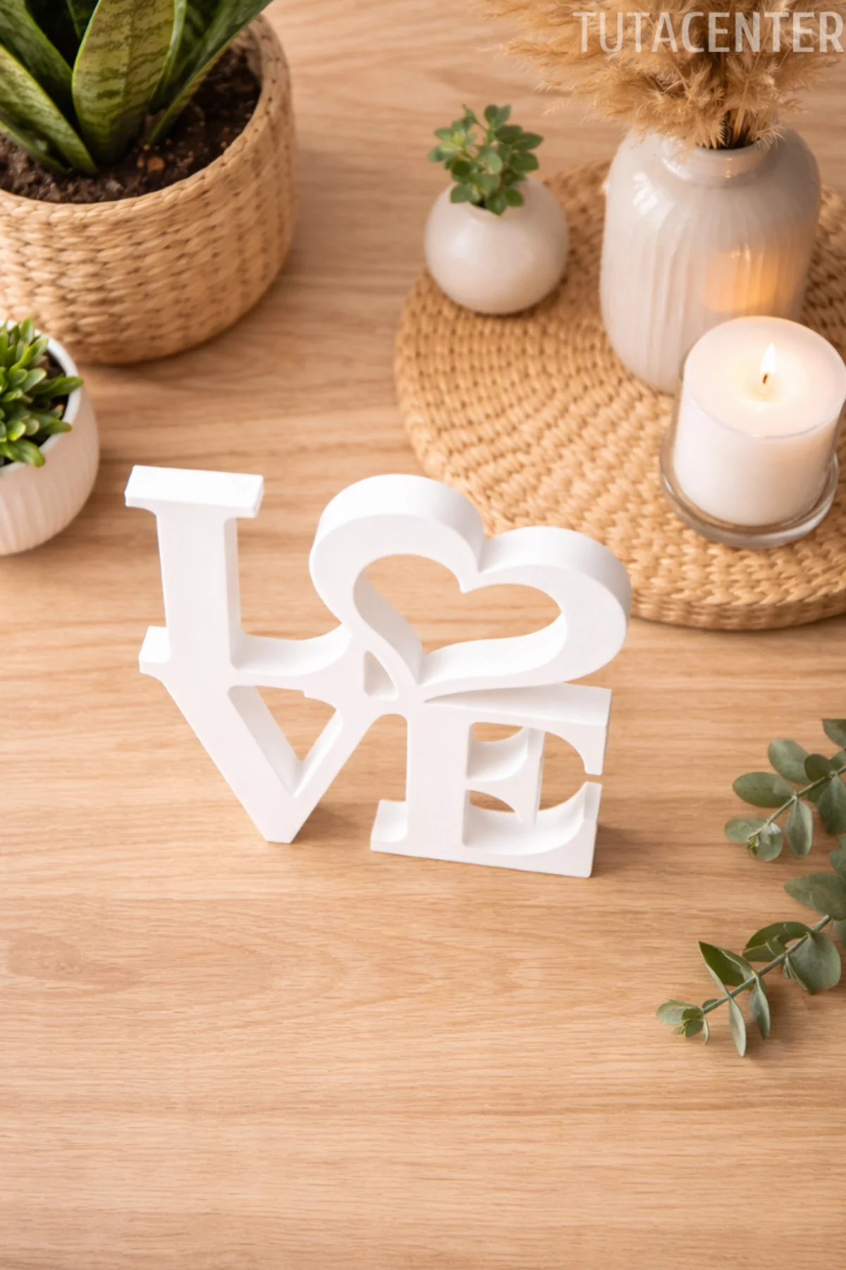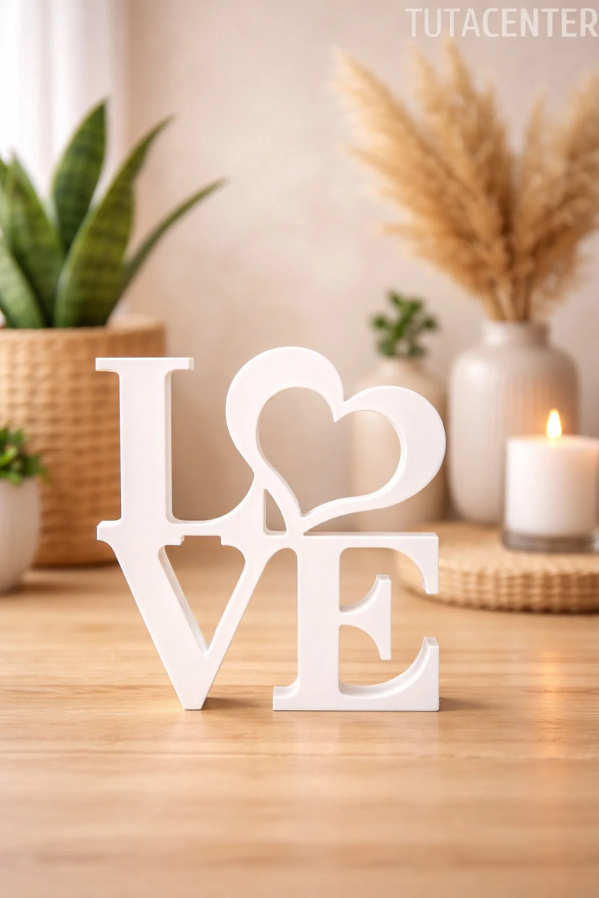 • Kalp detaylı LOVE yazısı, ev dekorasyonunda sevgi ve samimiyet hissi oluşturur.