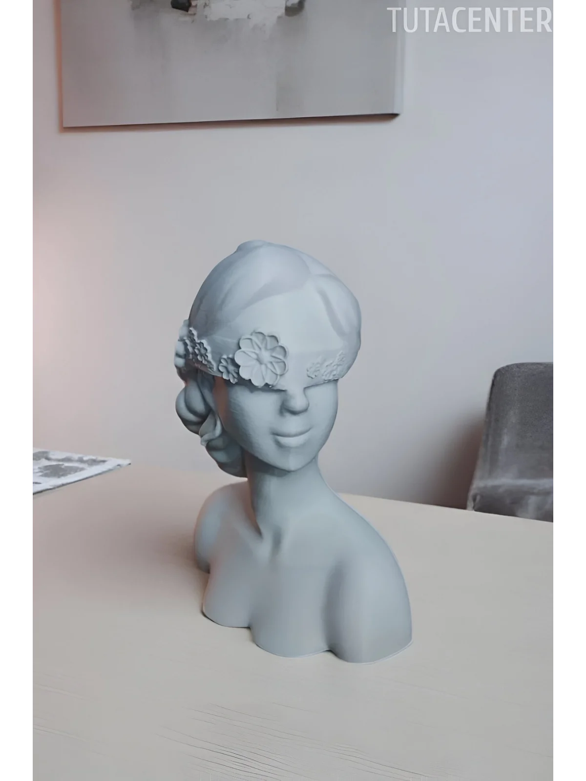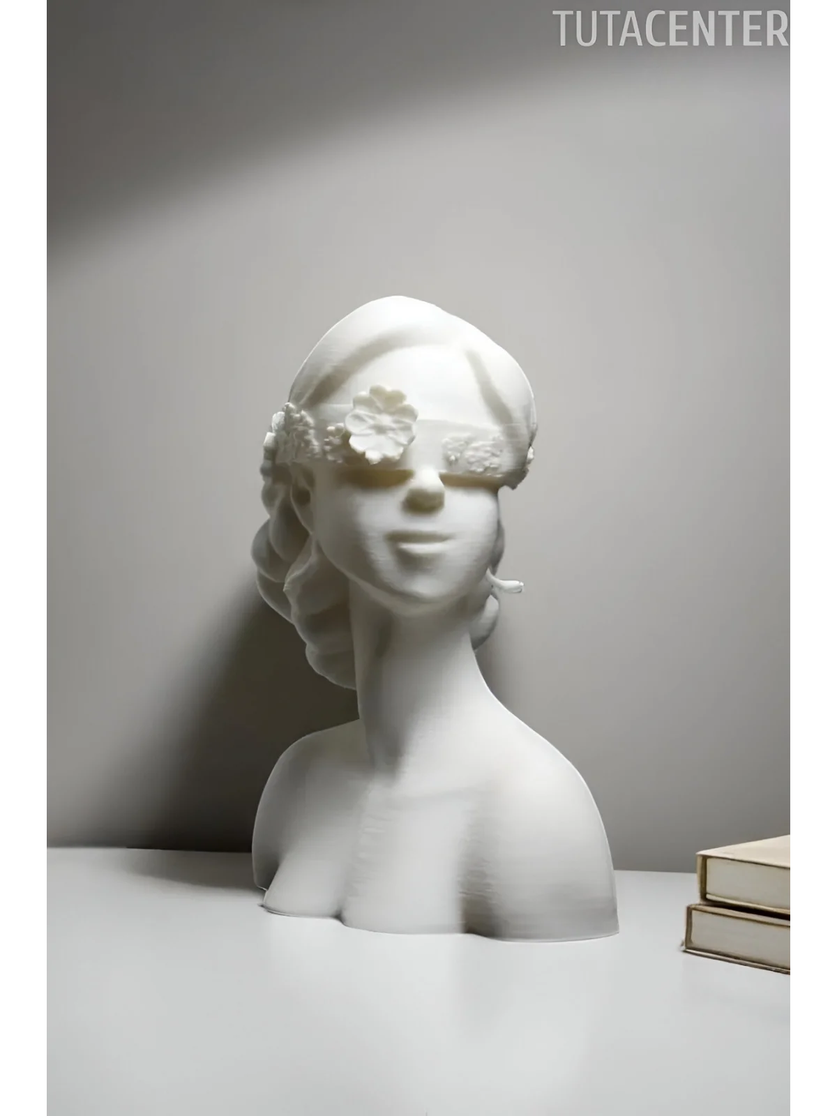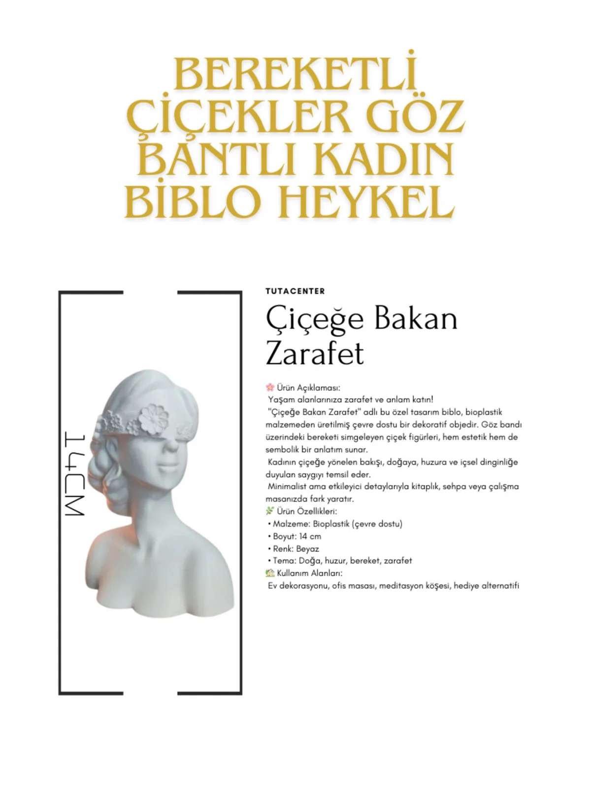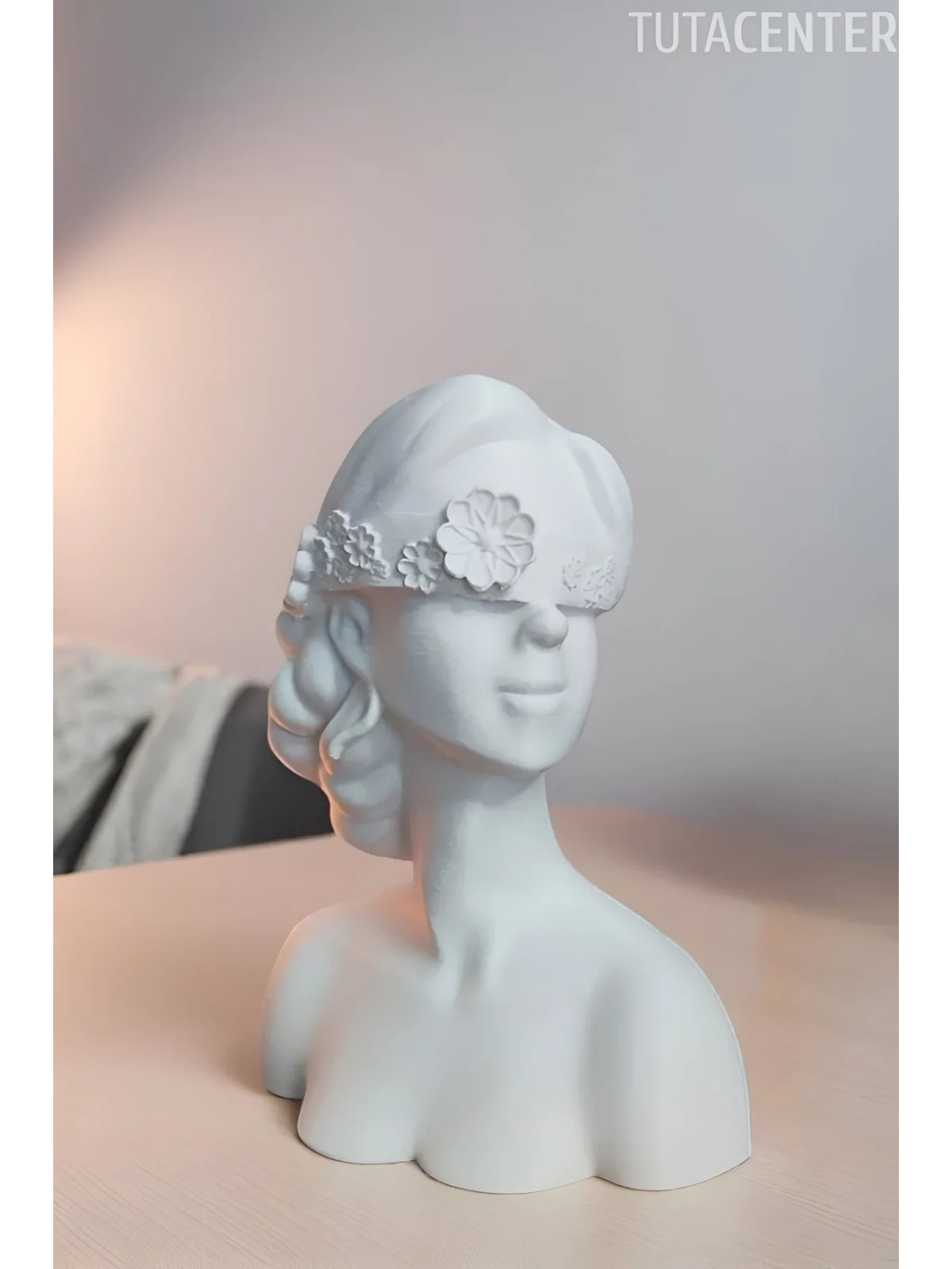Bereketli Çiçekler Göz Bantlı Kadın Biblo Heykel – Bioplastik Ev Dekorasyonu, Zarif Biblo 14cm