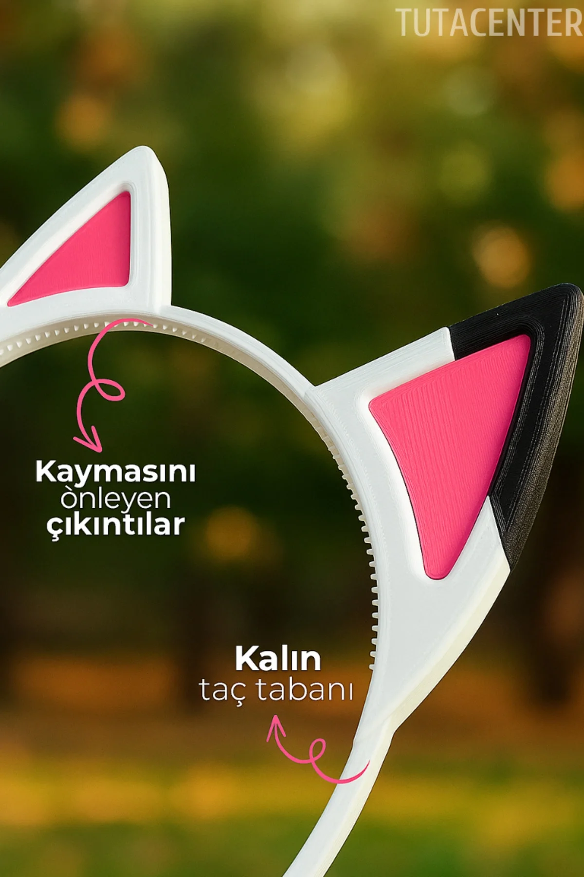 ✔ Kaymayı önleyen çıkıntılar sayesinde taç baştan düşmez ve sabit durur.; ✔ Kalın ve dayanıklı taç tabanı uzun süreli kullanım sunar.; ✔ Hafif ve konforlu yapısı sayesinde çocukların başını sıkmaz.; ✔ Renkli ve sevimli kedi kulağı tasarımı, oyun ve özel günler için idealdir.; ✔ 3D baskı teknolojisi ile üretilmiştir; detayları nettir ve yüzey kalitesi yüksektir.; ✔ Yerli üretimdir; Tuta Center güvencesiyle hazırlanmıştır.; ✔ Doğum günü, kostüm partisi, fotoğraf çekimi ve hediye için mükemmel bir tercihtir.; ✔ Canlı renkleri ile çocukların dikkatini çeker ve her ortamda şık durur.;