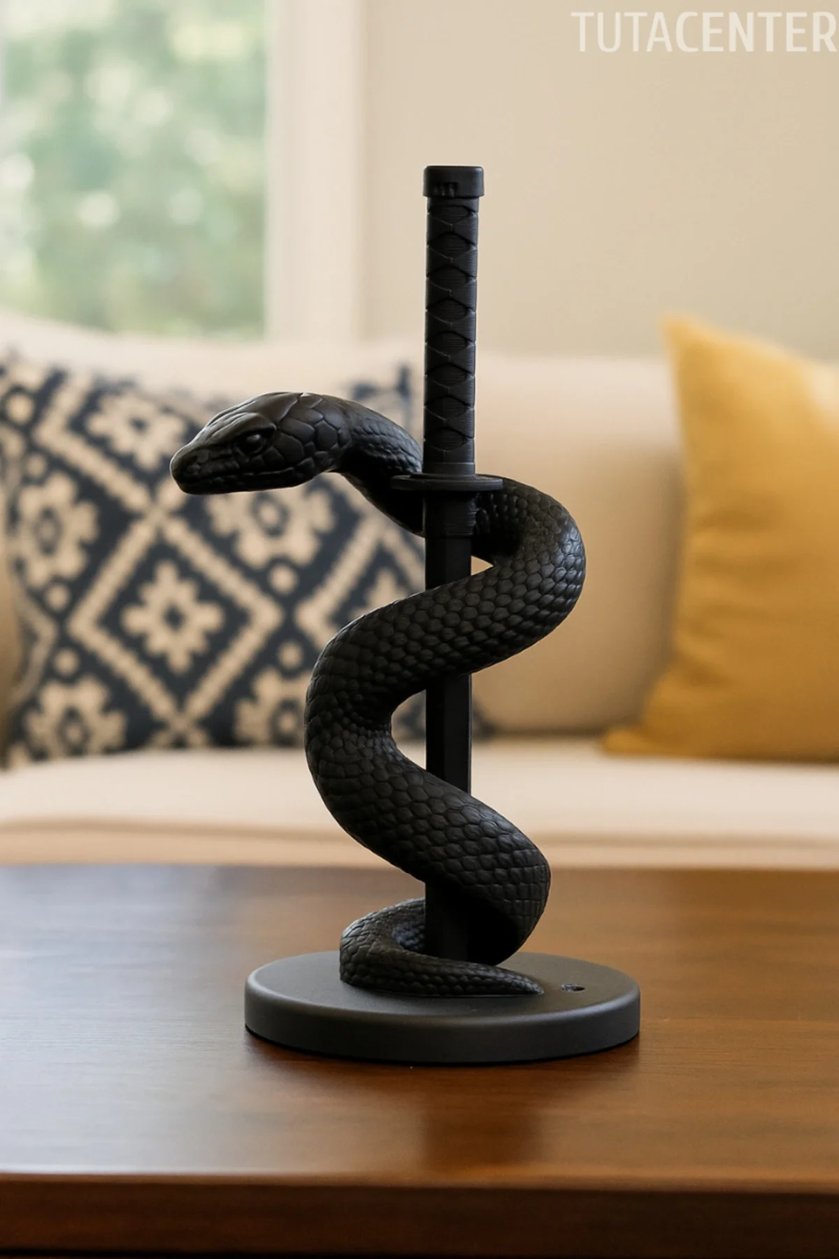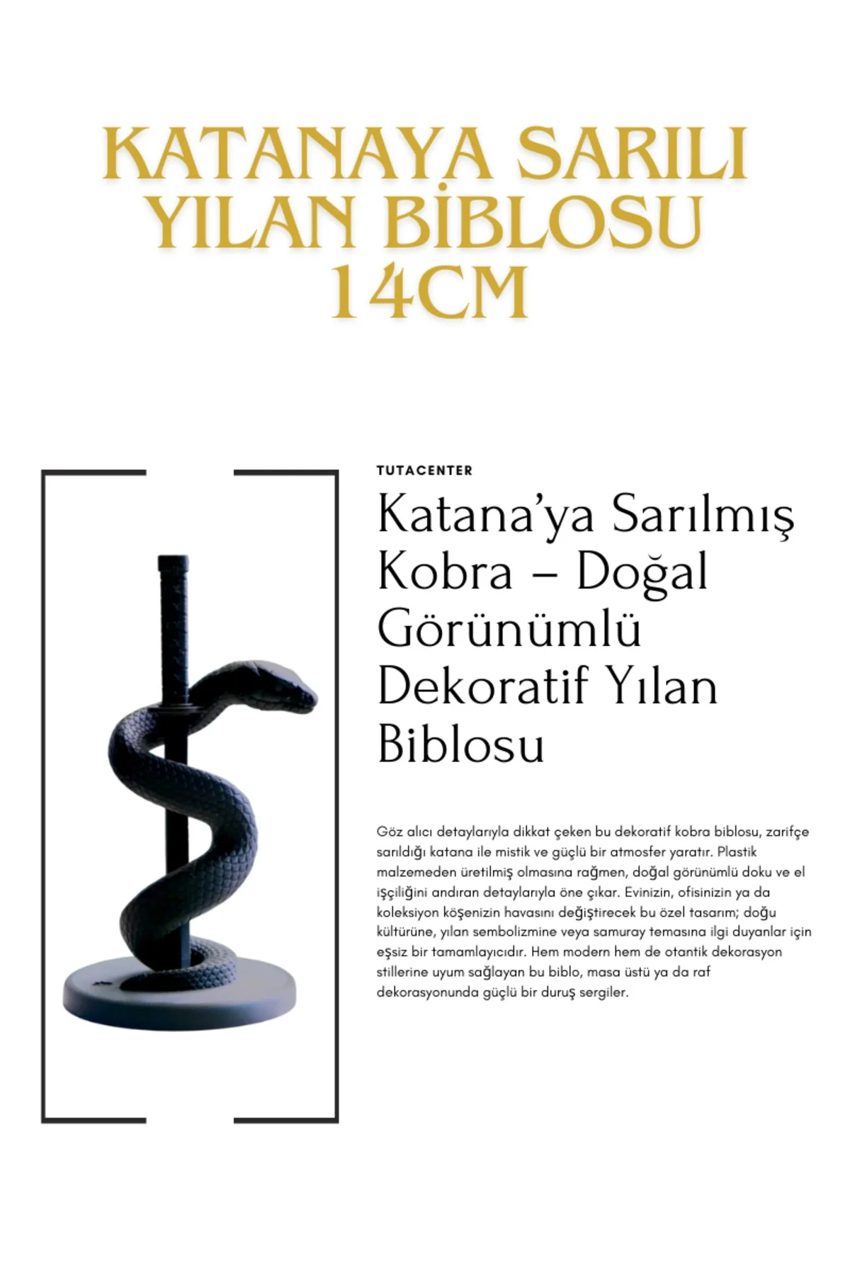 Göz alıcı detaylarıyla dikkat çeken bu dekoratif kobra biblosu, zarifçe sarıldığı katana ile mistik ve güçlü bir atmosfer yaratır.; Plastik malzemeden üretilmiş olmasına rağmen, doğal görünümlü doku ve el işçiliğini andıran detaylarıyla öne çıkar.; Evinizin, ofisinizin ya da koleksiyon köşenizin havasını değiştirecek bu özel tasarım; doğu kültürüne, yılan sembolizmine veya samuray temasına ilgi duyanlar için eşsiz bir tamamlayıcıdır.; Hem modern hem de otantik dekorasyon stillerine uyum sağlayan bu biblo, masa üstü ya da raf dekorasyonunda güçlü bir duruş sergiler.; #KatanaKobraBiblo #YılanFigürü #SamurayDekoru #DekoratifYılanHeykeli #MasaÜstüSüs #PlastikYılanBiblosu #DoğuKültürüDekorasyonu #ModernEvAksesuarı
