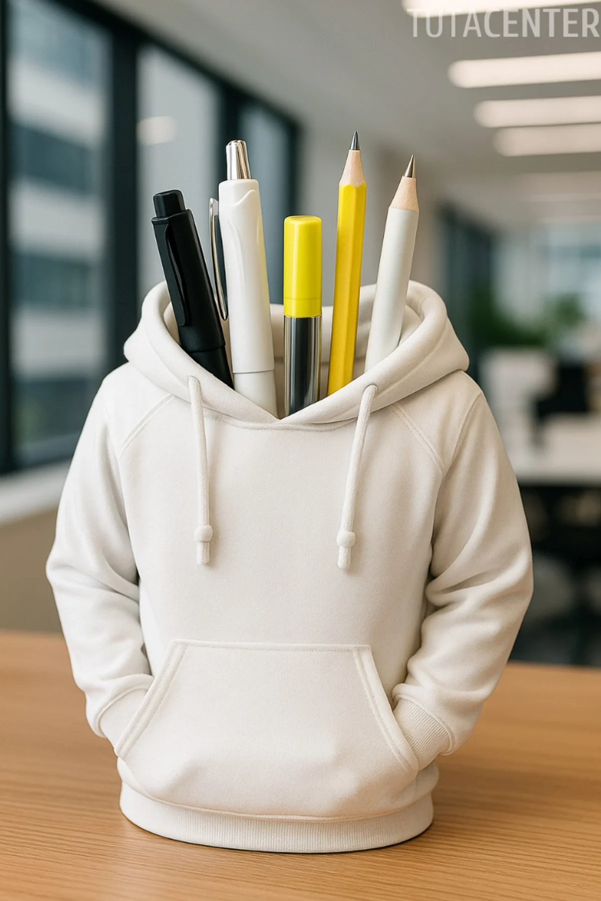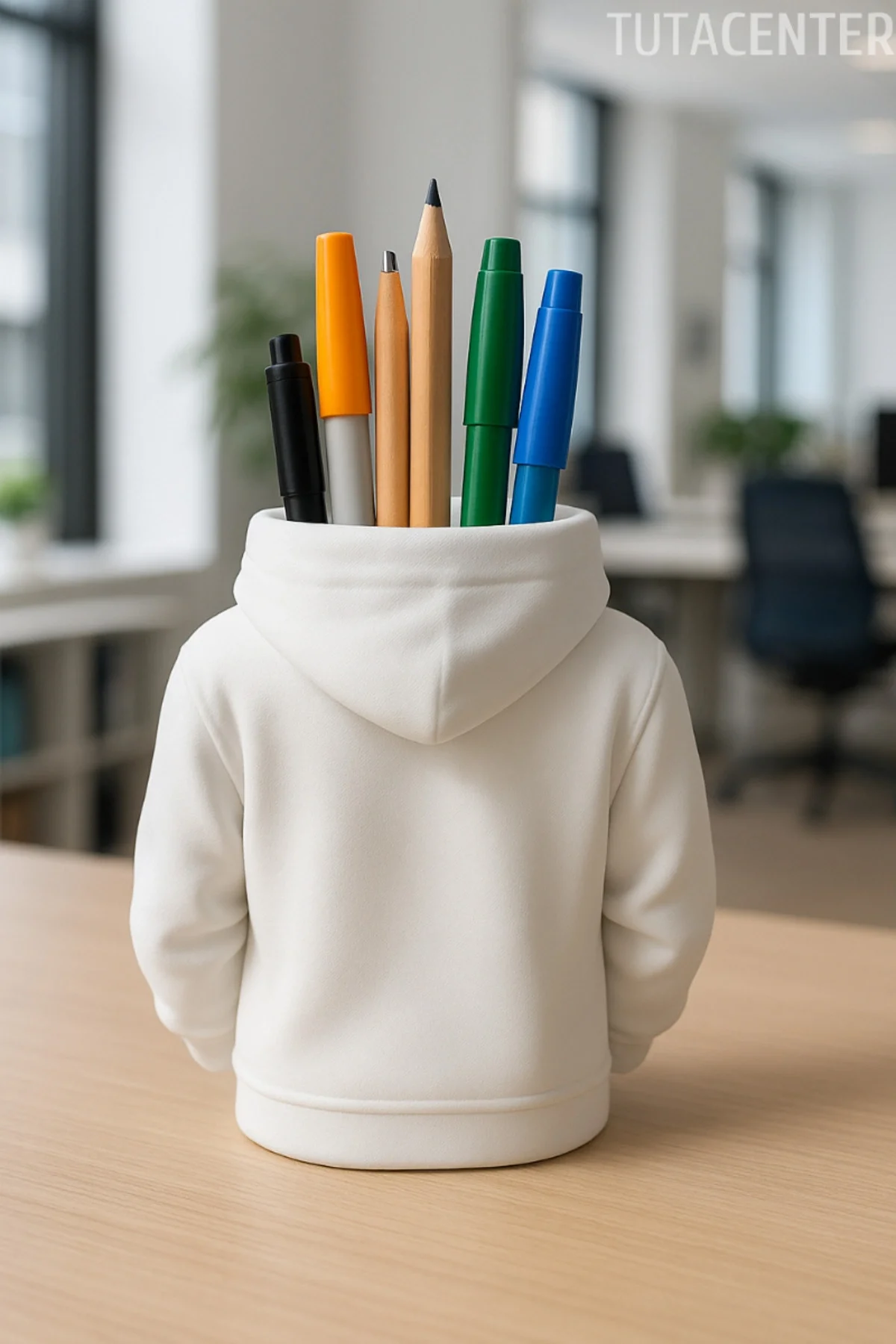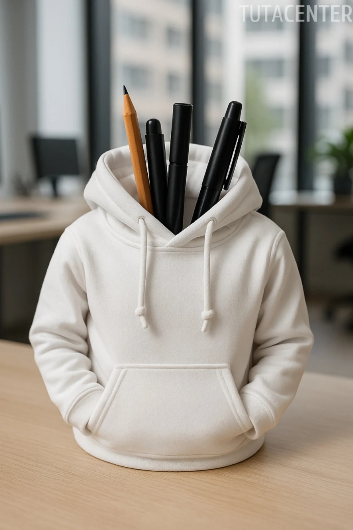 Modern ve Şık Tasarım:Kapüşonlu sweatshirt formuyla dikkat çeken bu kalemlik, masanıza eğlenceli ve tarz bir dokunuş katıyor.