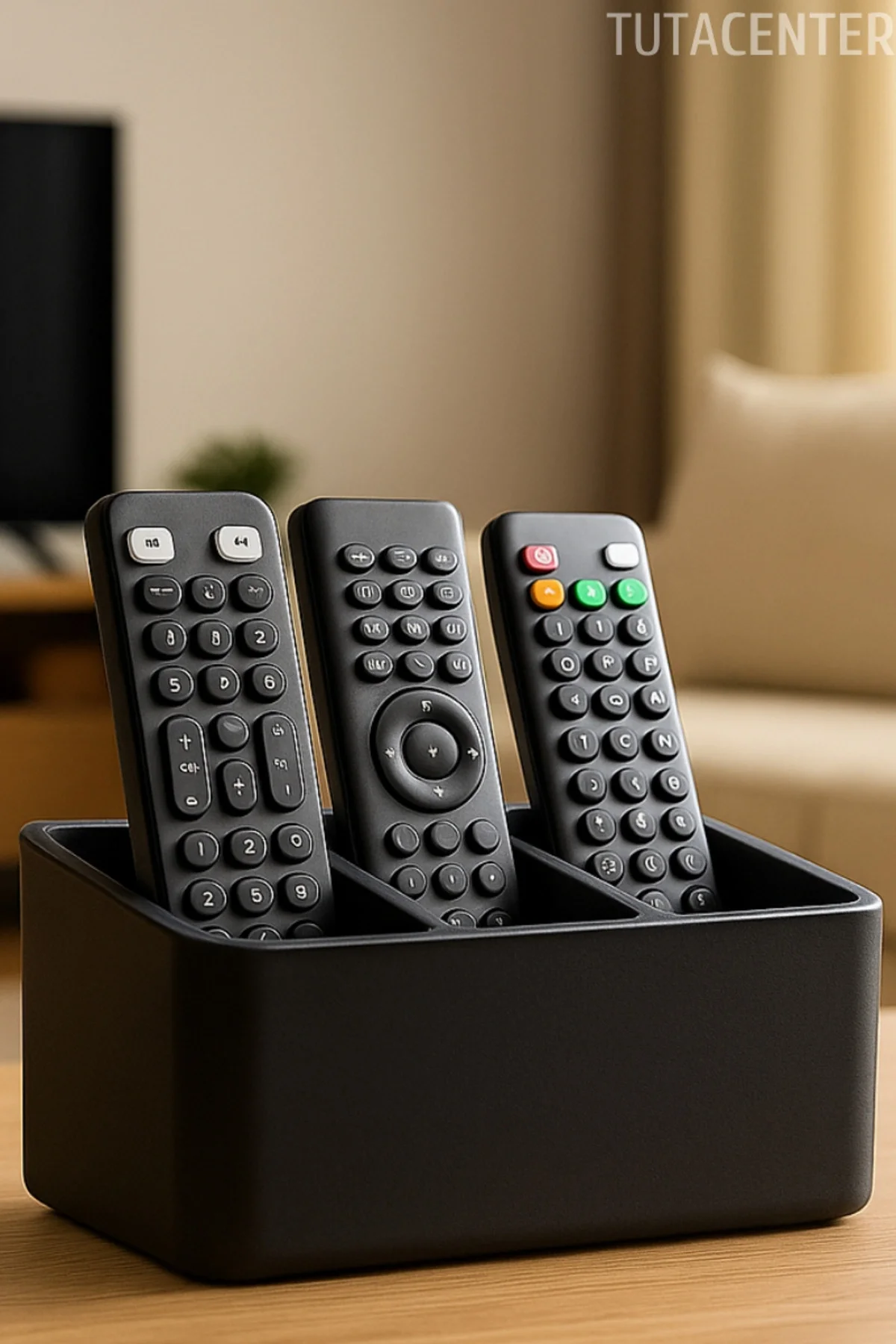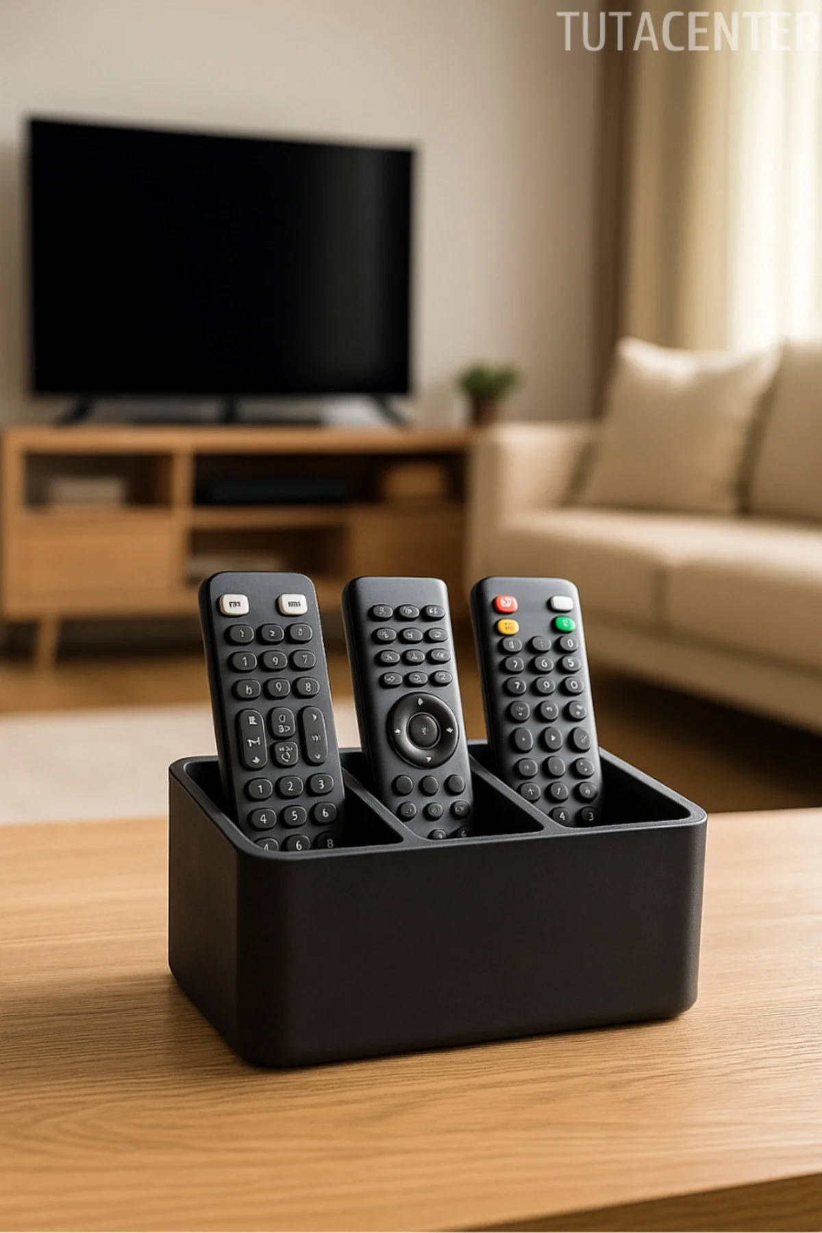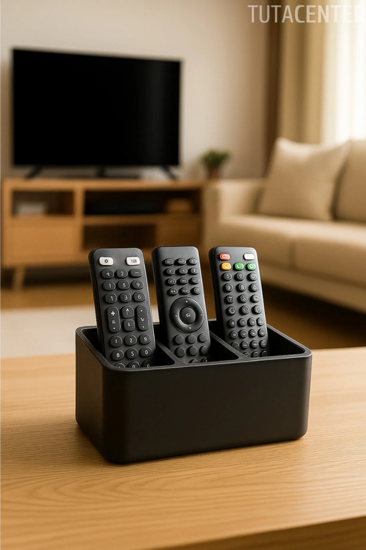 Sert plastikten üretilmiş olan bu dayanıklı kumanda tutucu, şık siyah rengiyle her türlü dekorasyona uyum sağlar. Üç ayrı bölmesi sayesinde farklı kumandaları düzenli bir şekilde saklamanıza yardımcı olur. Televizyon, klima, ses sistemi gibi cihazlara ait kumandalar için ideal bir organizatördür.