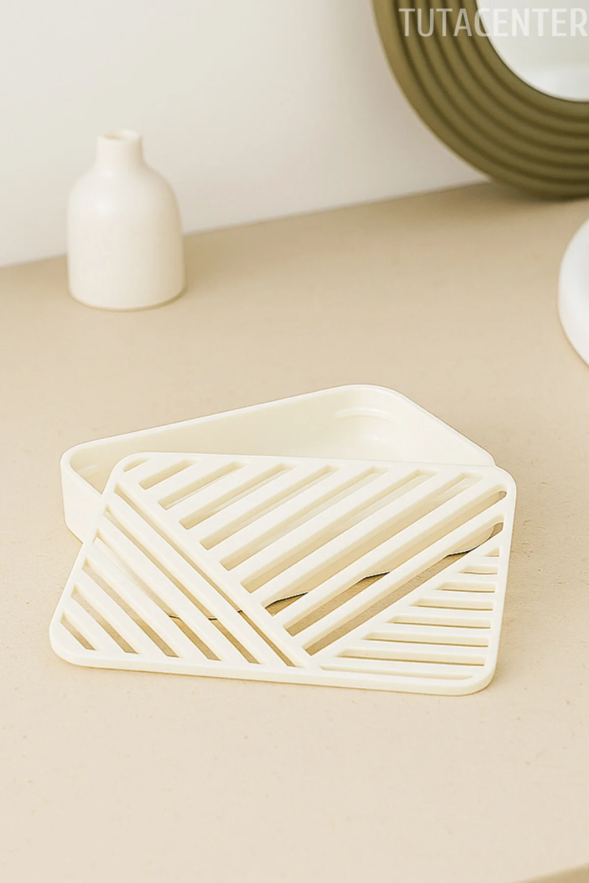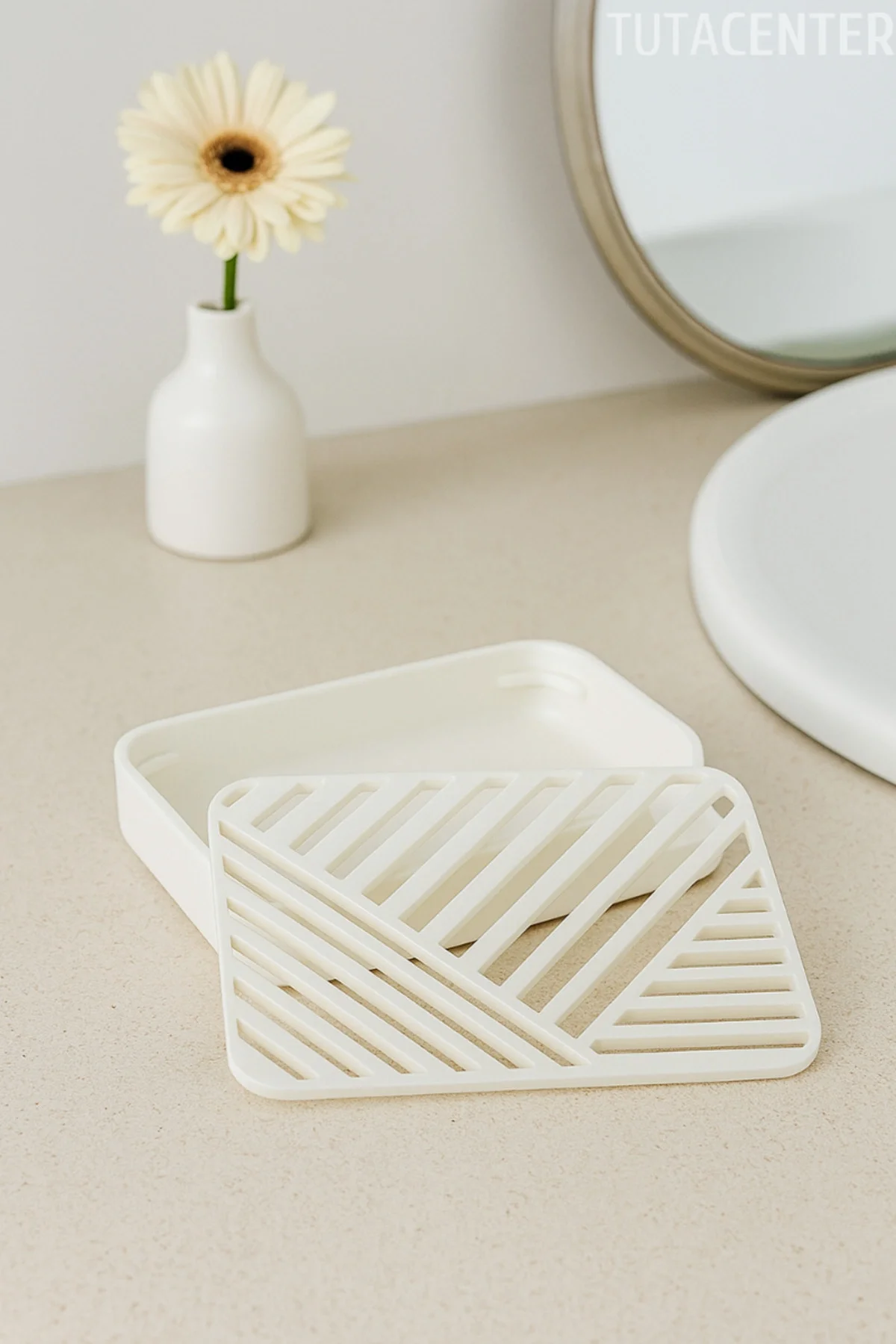 Boyutlar: 120 mm x 85 mm Modern ve minimal çizgili tasarım, her banyo veya mutfak dekorasyonuna kolayca uyum sağlar Çıtalı tahliye sistemi sayesinde sabun altında su birikmesini önler, sabununuz daha uzun süre dayanır İki parçalı yapı: Üstte çıtalı tabaka, altta su biriktirmeyen hazne.; Temizlemesi kolay, hijyeniktir Küflenme ve yumuşama karşıtı tasarım, sabunu kuru tutar ve daha hijyenik bir kullanım sağlar Kaymaz taban, ürünün tezgâhta sabit kalmasını sağlar Yer kaplamayan kompakt yapı ile lavabo kenarlarında veya duş alanlarında rahatlıkla kullanılabilir Banyo, mutfak, duş kabini, çamaşır odası gibi farklı alanlarda kullanıma uygundur Kolay temizlenebilir; sadece durulayıp kurutmanız yeterlidir Estetik görünümüyle dekoratif bir detay olarak da öne çıkar
