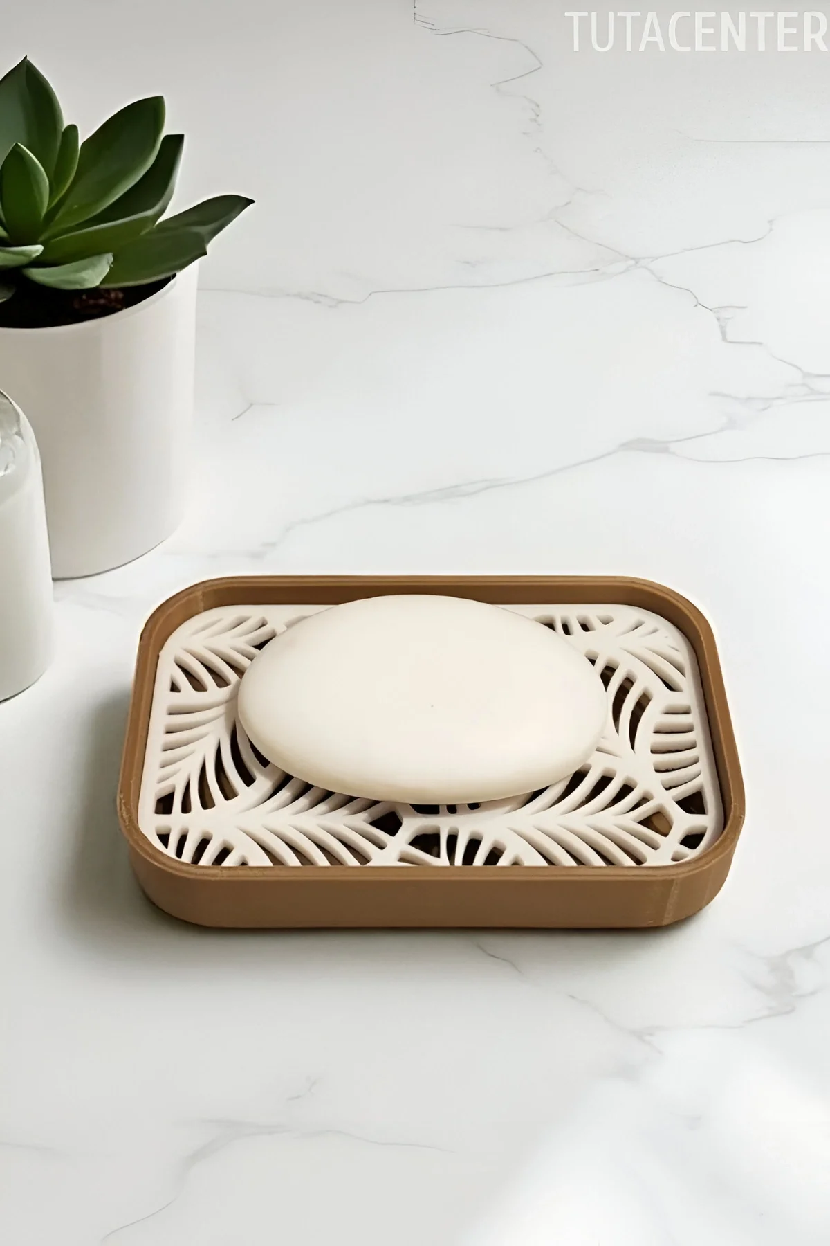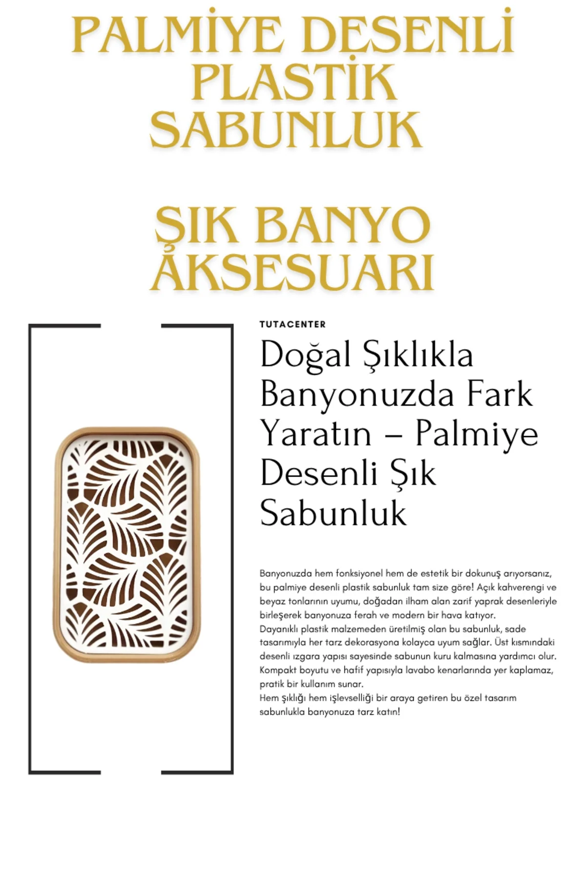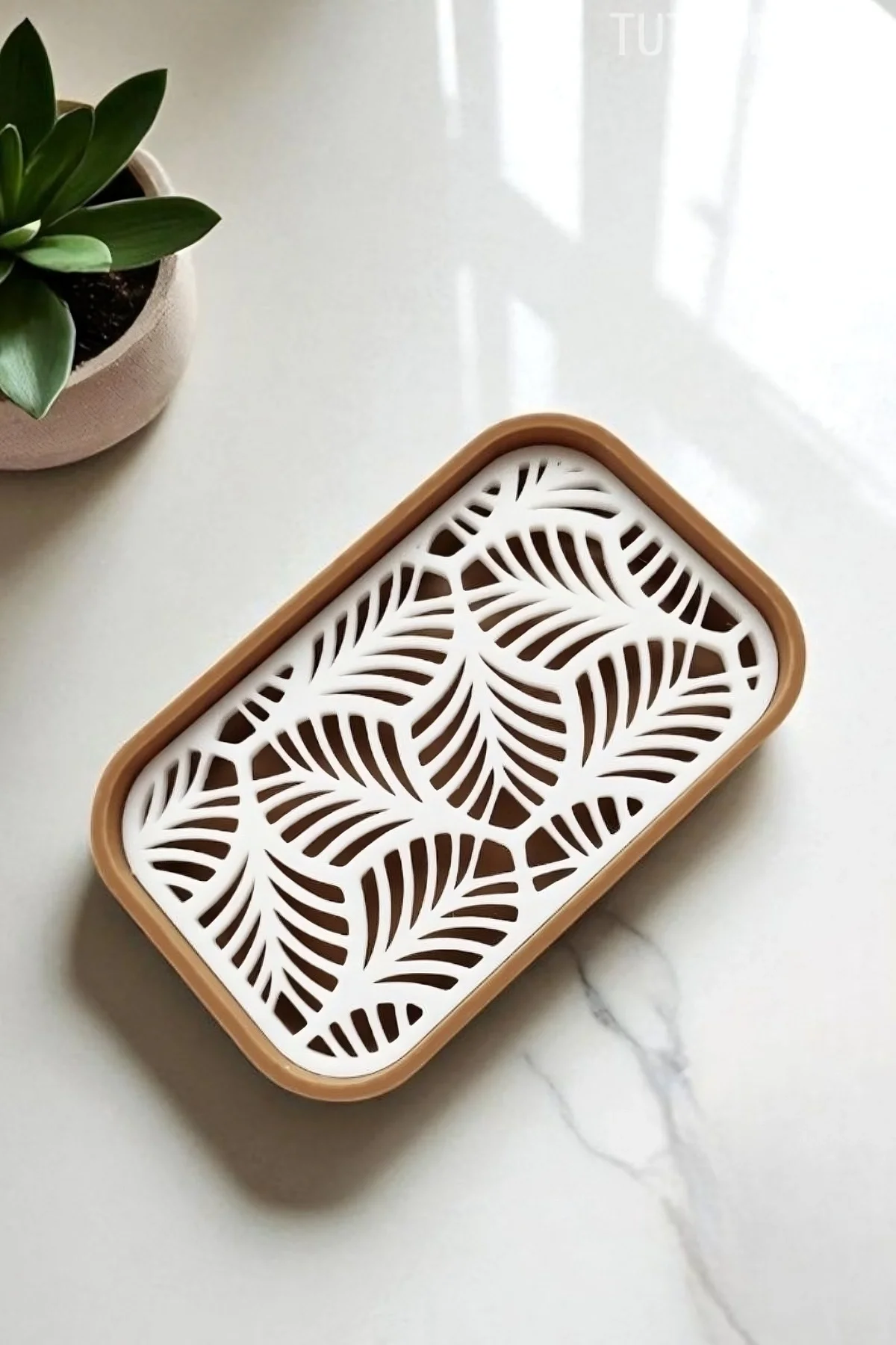 Banyonuzda hem fonksiyonel hem de estetik bir dokunuş arıyorsanız, bu palmiye desenli plastik sabunluk tam size göre! Açık kahverengi ve beyaz tonlarının uyumu, doğadan ilham alan zarif yaprak desenleriyle birleşerek banyonuza ferah ve modern bir hava katıyor.