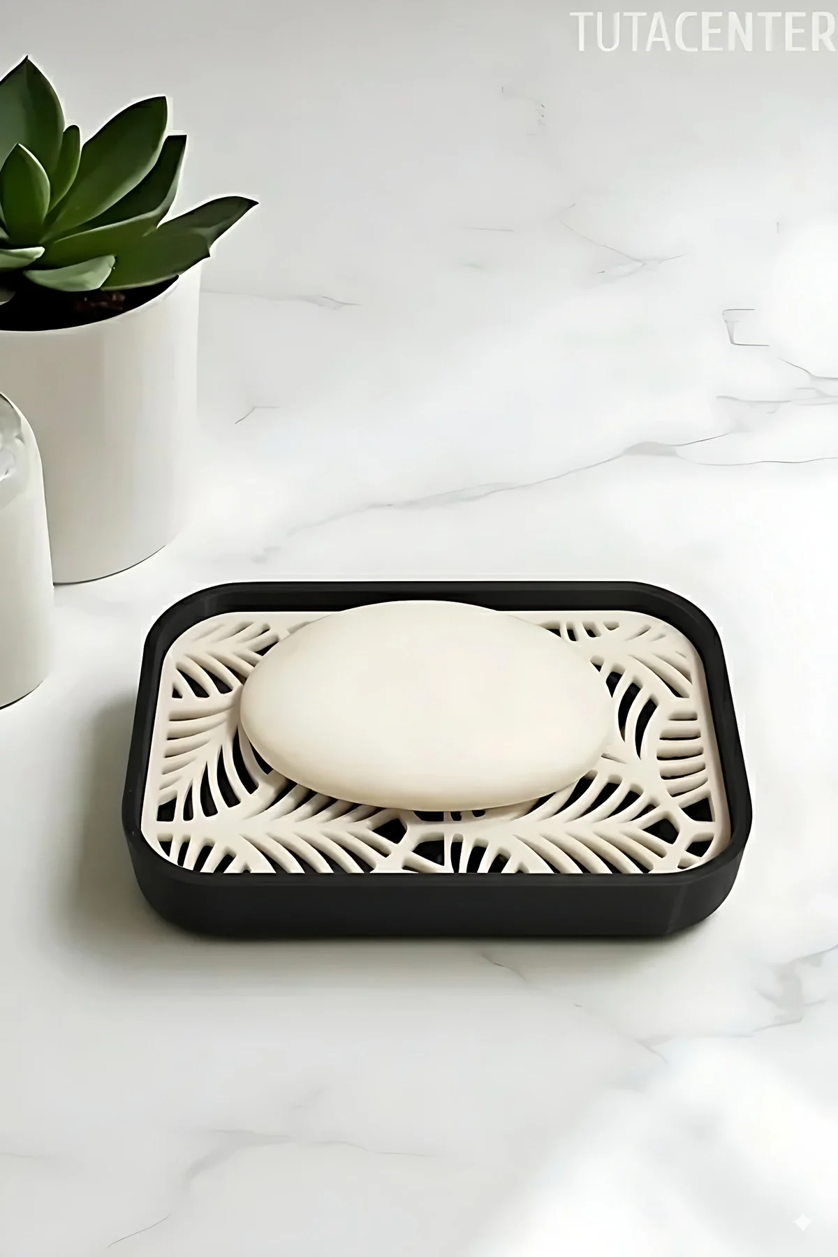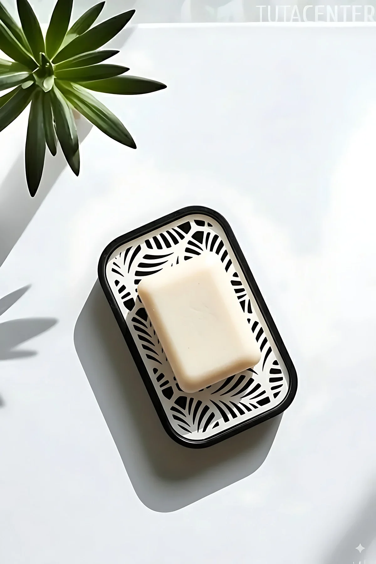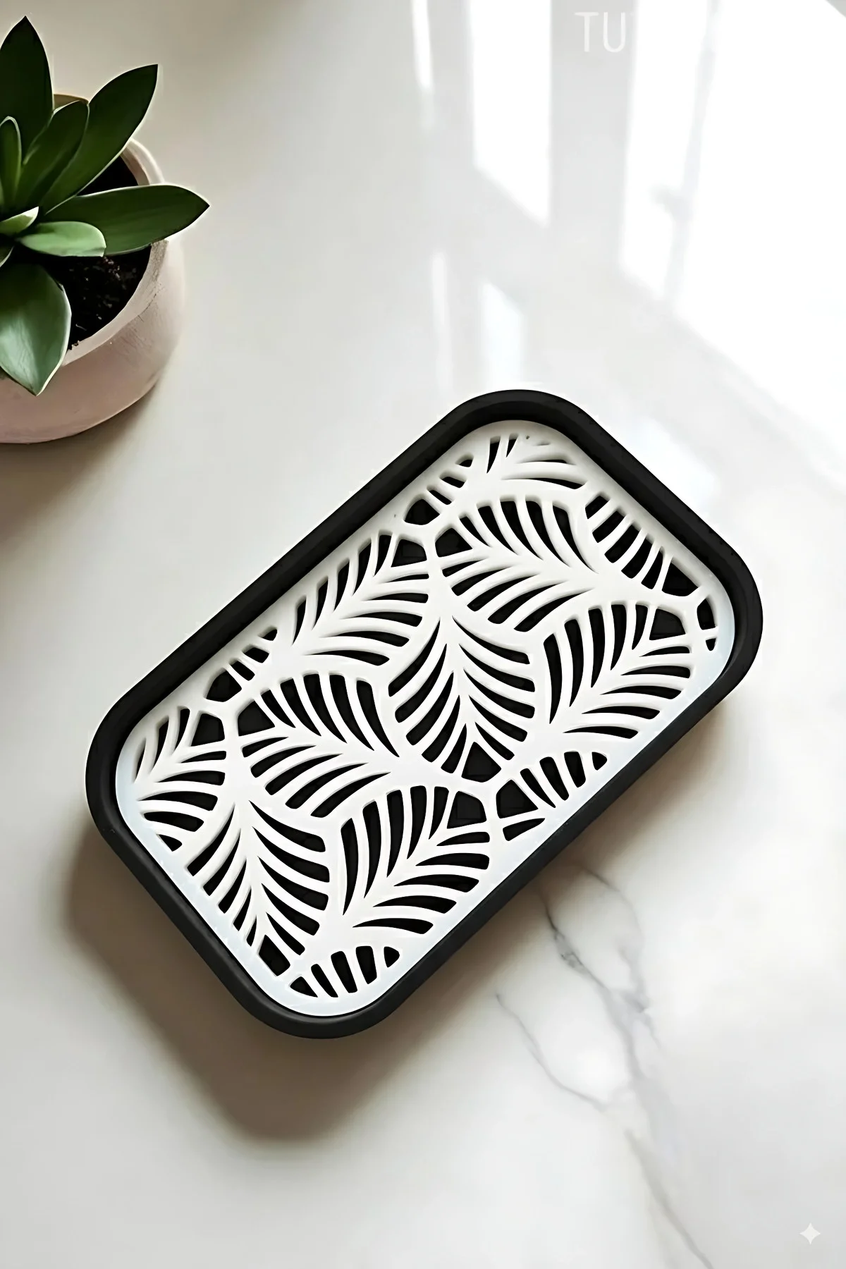 Banyonuzda hem fonksiyonel hem de estetik bir dokunuş arıyorsanız, bu palmiye desenli plastik sabunluk tam size göre! Siyah ve Beyaz tonlarının uyumu, doğadan ilham alan zarif yaprak desenleriyle birleşerek banyonuza ferah ve modern bir hava katıyor.