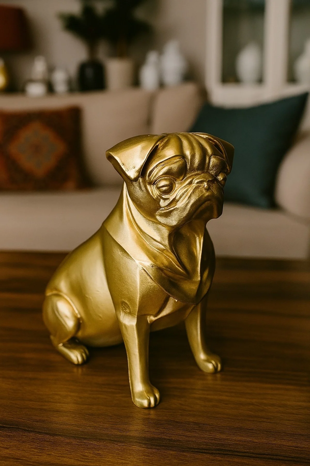 Zarif tasarımı ve sevimli pug detaylarıyla ev dekorasyonunuza şıklık katacak bu biblo, altın rengiyle göz alıcı bir görünüm sunar. Dayanıklı plastik malzemeden üretilen ve 20 cm yüksekliğinde olan bu masa üstü süs, salon, ofis veya vitrinlerde modern ve estetik bir dokunuş sağlar. Hayvan figürlerini sevenler için ideal bir hediye seçeneğidir.