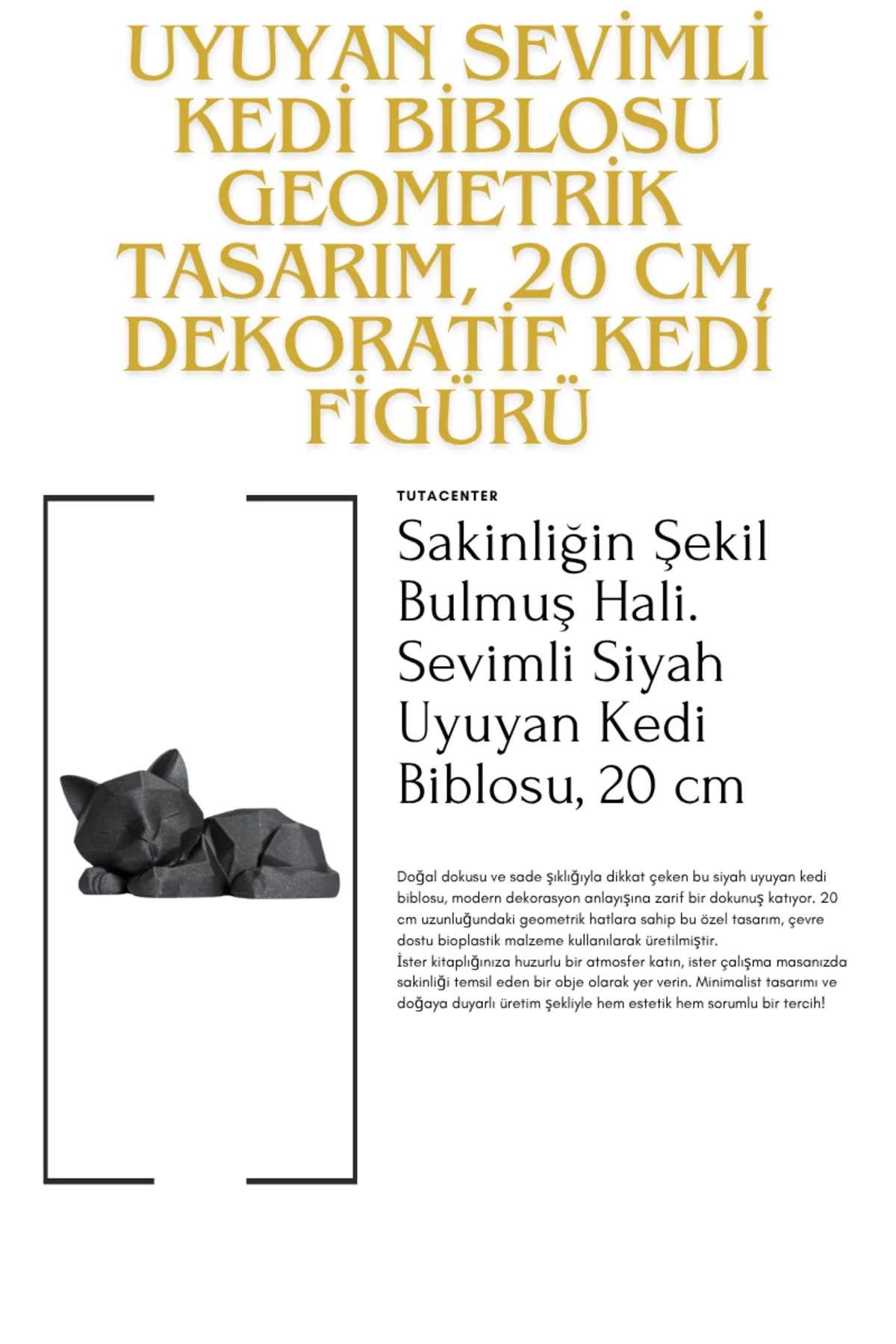 Doğal dokusu ve sade şıklığıyla dikkat çeken bu siyah uyuyan kedi biblosu, modern dekorasyon anlayışına zarif bir dokunuş katıyor. 20 cm uzunluğundaki geometrik hatlara sahip bu özel tasarım, çevre dostu bioplastik malzeme kullanılarak üretilmiştir.